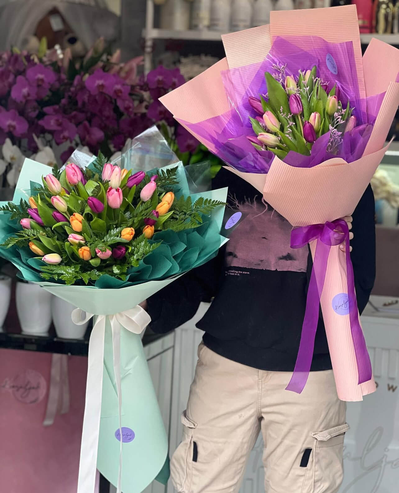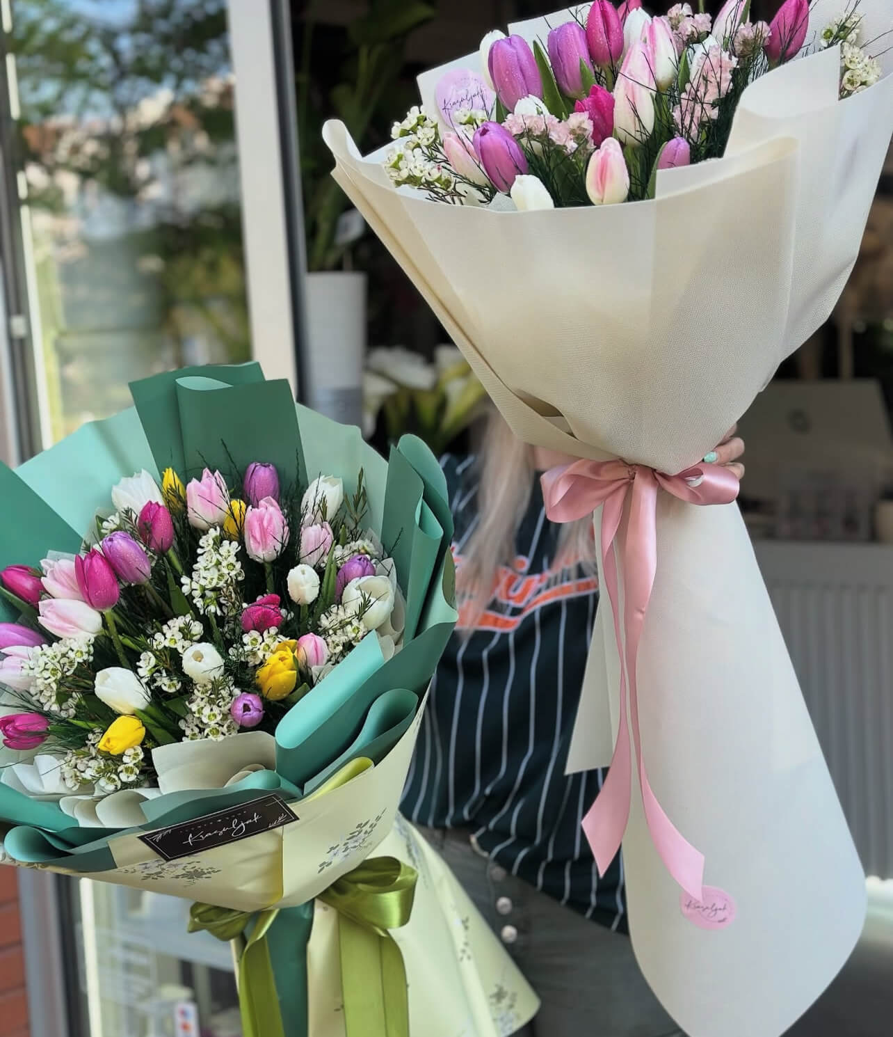 Lale podjednako lepo izgledaju i u buketu i u fišeku – razlika je u stilu. Buket deluje formalnije i svečanije, dok fišek daje jednostavniji i moderniji utisak.<br />
